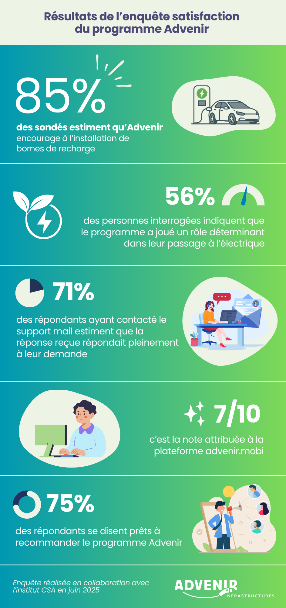 Cette enquête de satisfaction confirme l’impact incitatif d’Advenir dans la transition vers la mobilité électrique. En effet, 85 % des sondés estiment qu’Advenir encourage l’installation de bornes et 56 % indiquent que le programme a joué un rôle déterminant dans leur passage à l’électrique.